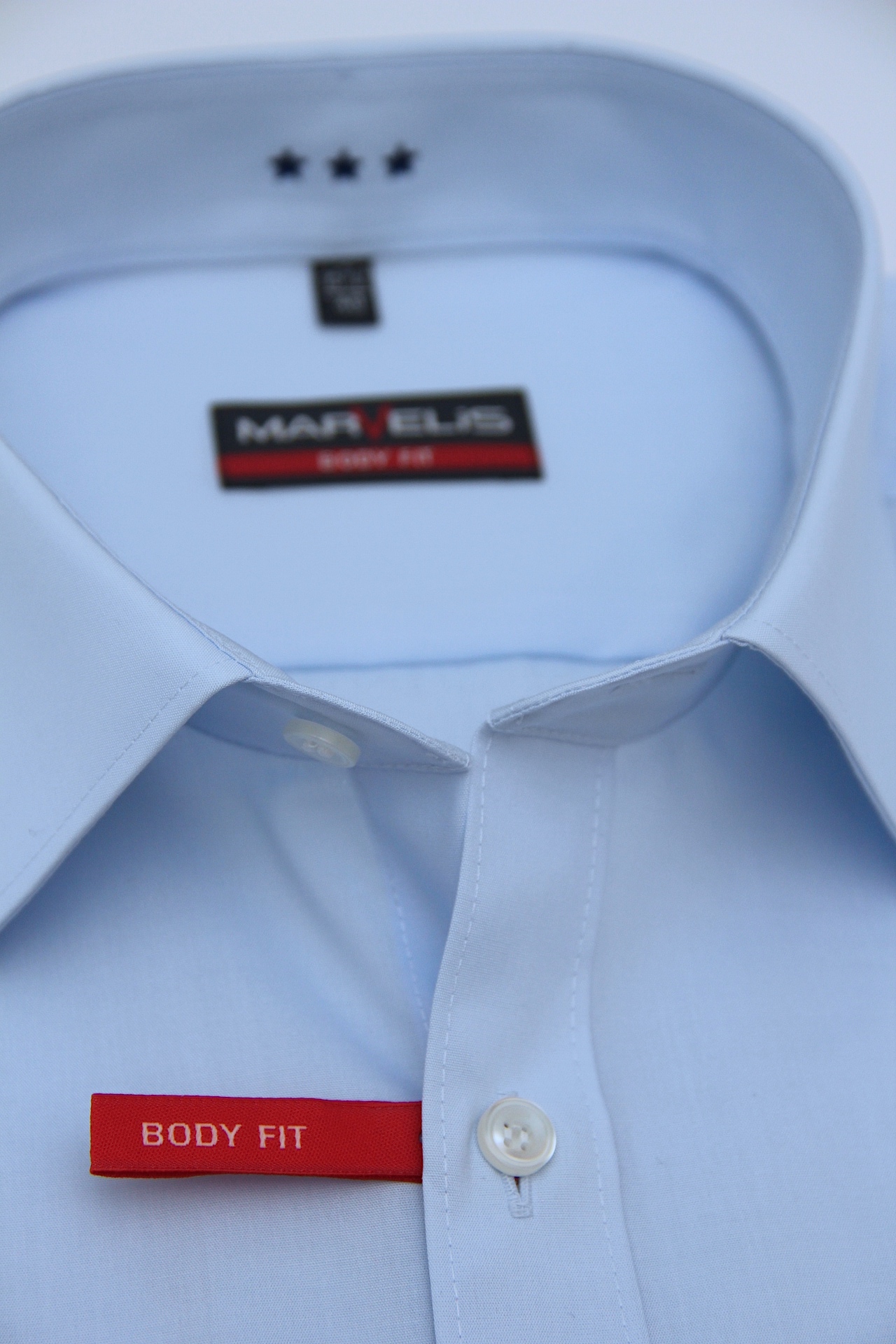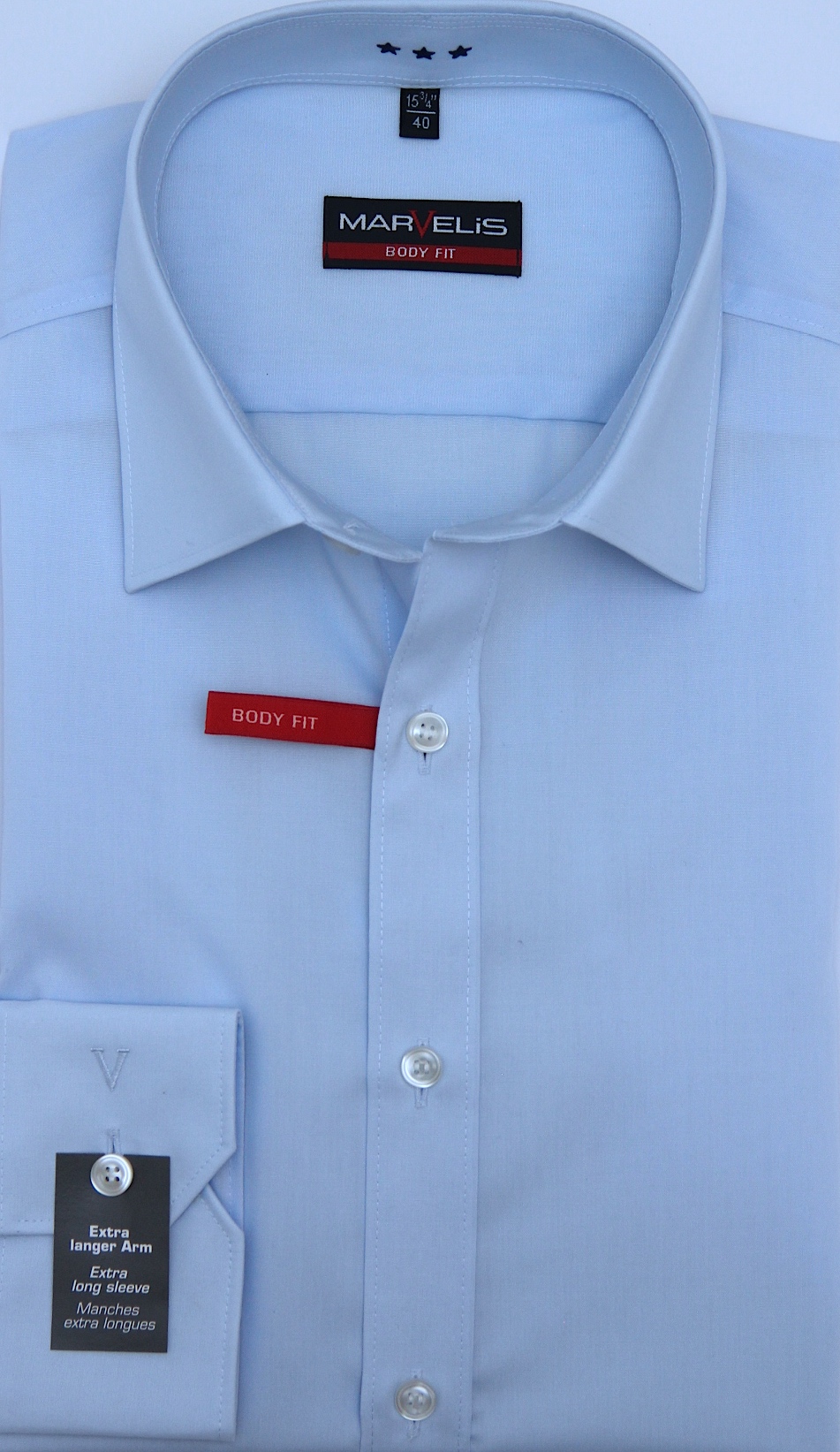 Farbe hellblau, Kragen Kent, ohne Brusttasche.