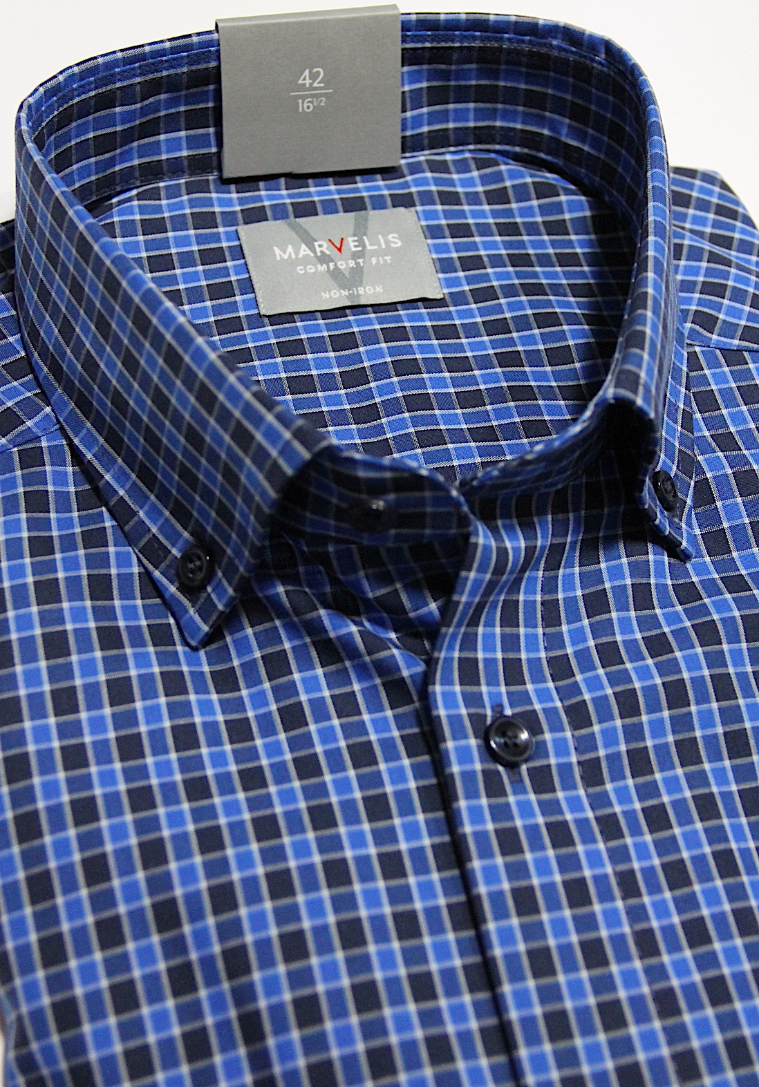 Ein Karo Muster in marine, blau, weiß.