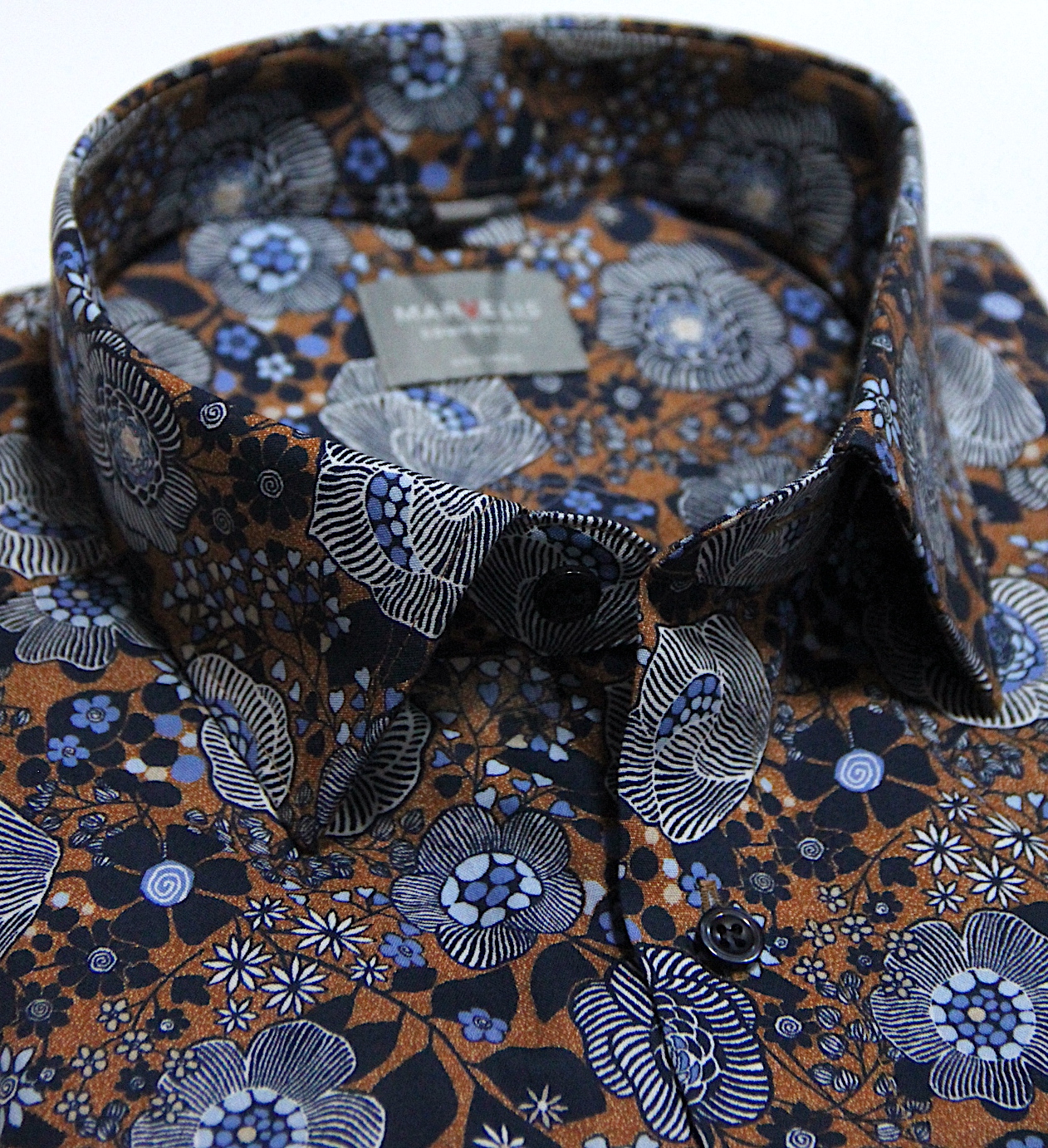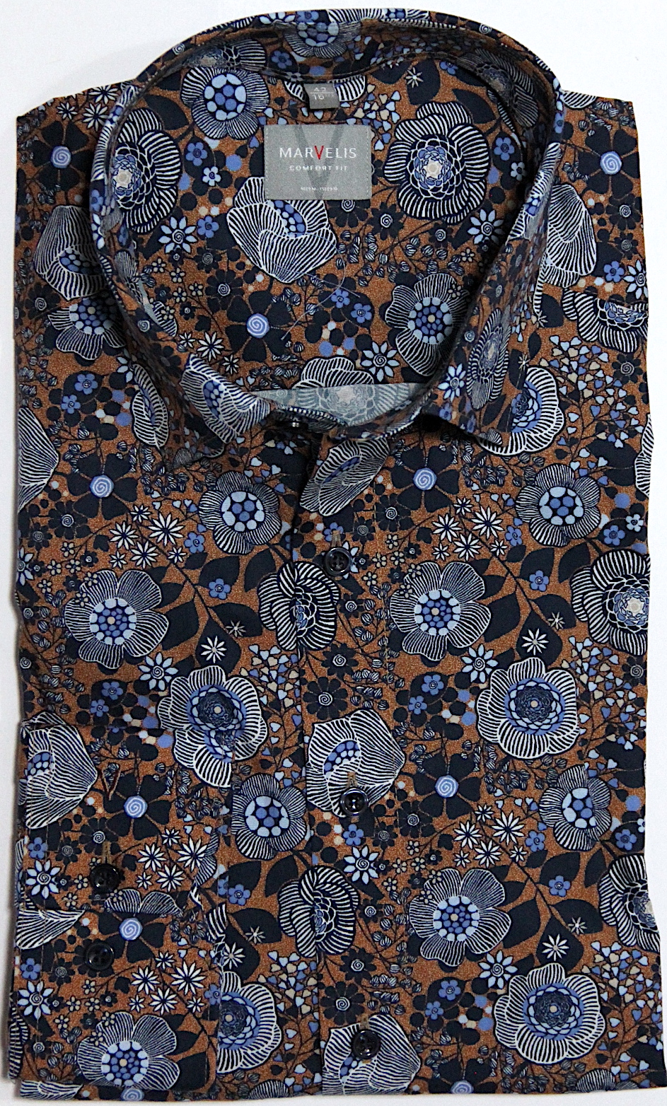 in marine, blau auf Braunfond.