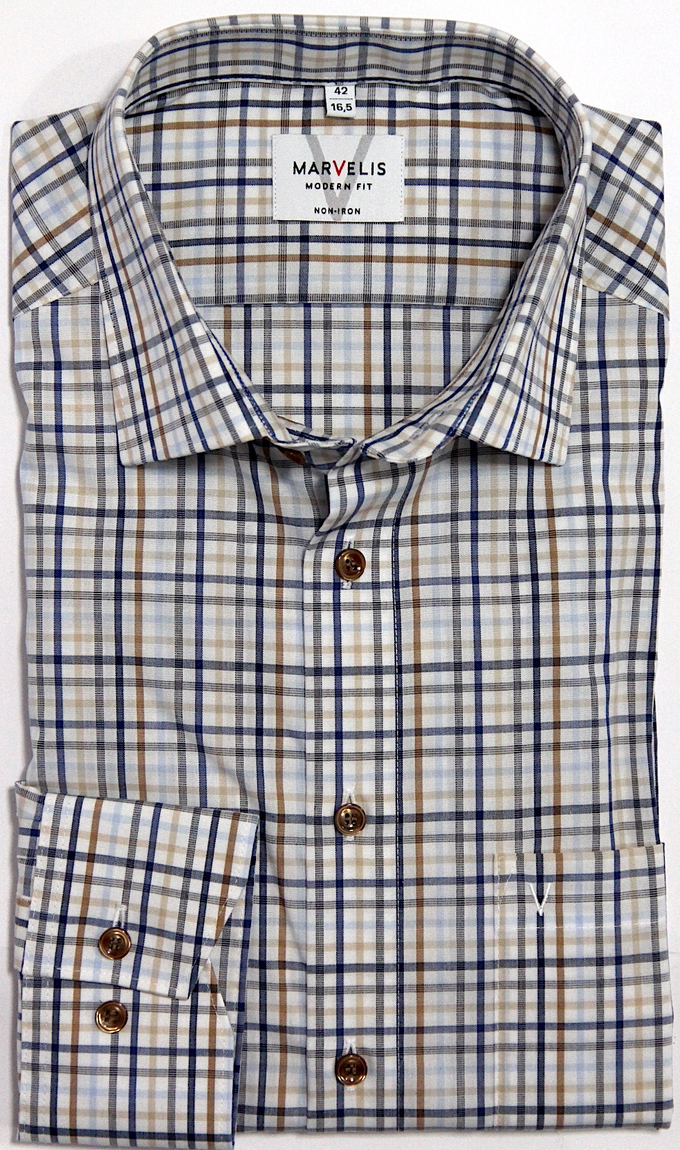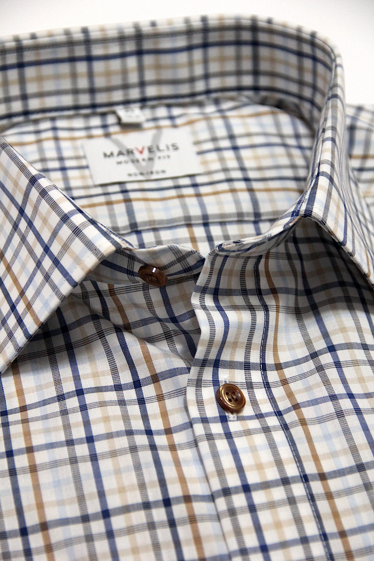 Ein Karo Muster in blau, beige, auf Weißfond.