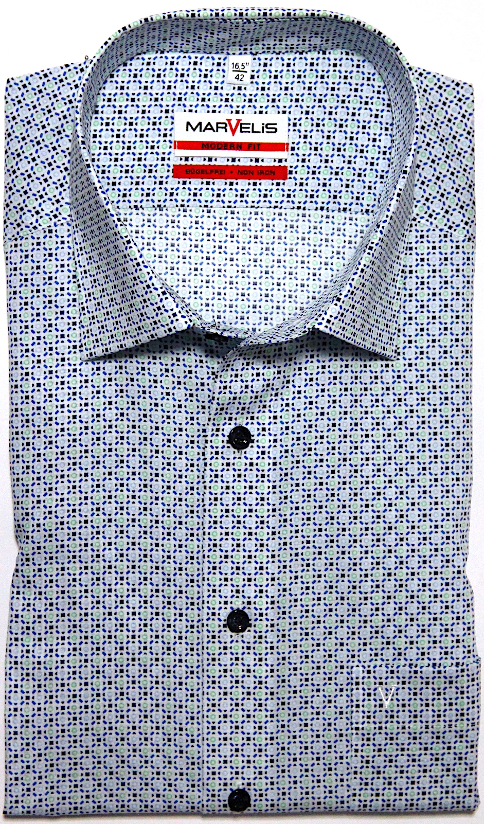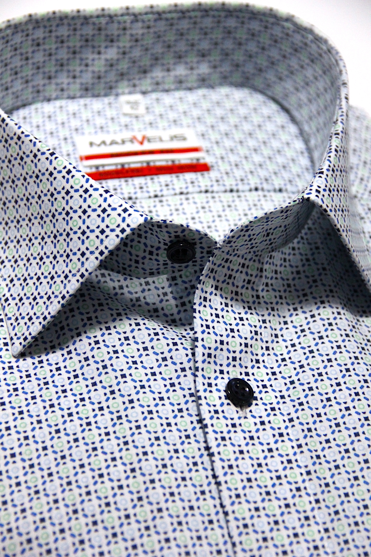 Ein Printmuster in blau, grün auf Weißfond.